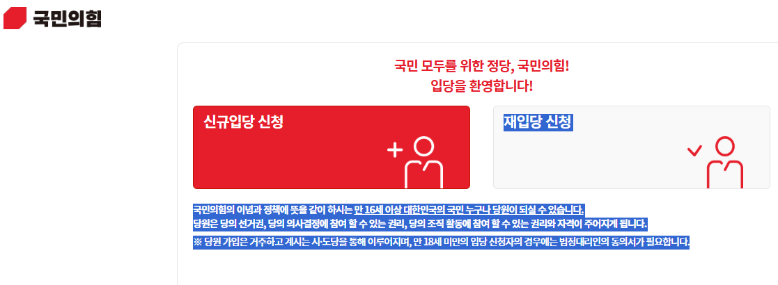1. 국민의힘 공식 홈페이지 접속 :당원 -> 당원가입 메뉴 후 가입 절차