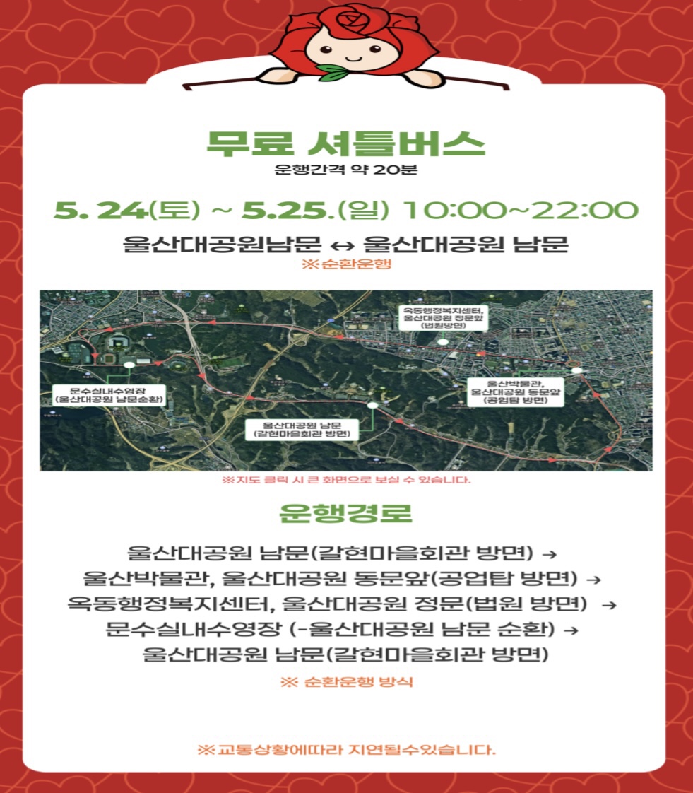 [울산대공원남문(장미원 주출입구/정류장 22410) 경유버스] 472, 753 [울산대공원정문로터리(정류장 21904) 경유버스] 918, 918(지원1) [옥동행정복지센터.울산대공원정문(정류장 40608, 40609) 경유버스] 124