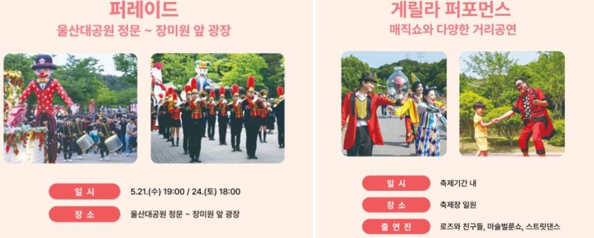 | 개막행사 | * 5월 21일(수요일) : 오후 8:00 ~ 오후 8:30분 * 장소 : 장미원 내 특설무대 * 내용 : 점등 퍼포먼스 & 불꽃쇼 |