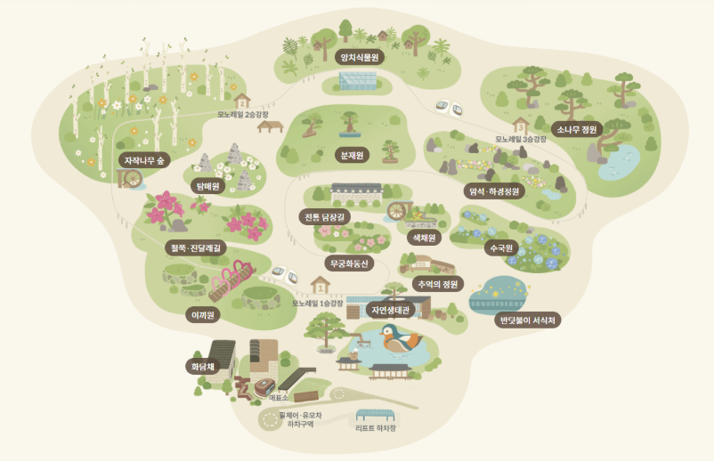 ⊙ 입구 →  수국원 → 이끼원 →전통공원 → 단풍나무원 → 습지정원 →출구