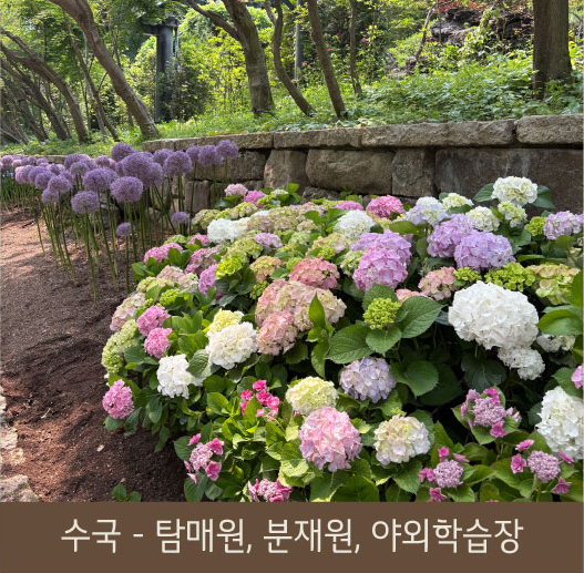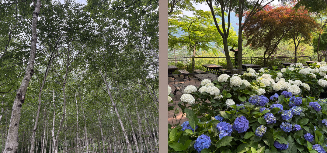 하늘색, 연보라, 순백, 연분홍 등 다양한 수국이 화담숲 안 곧곧에 피어있습니다.